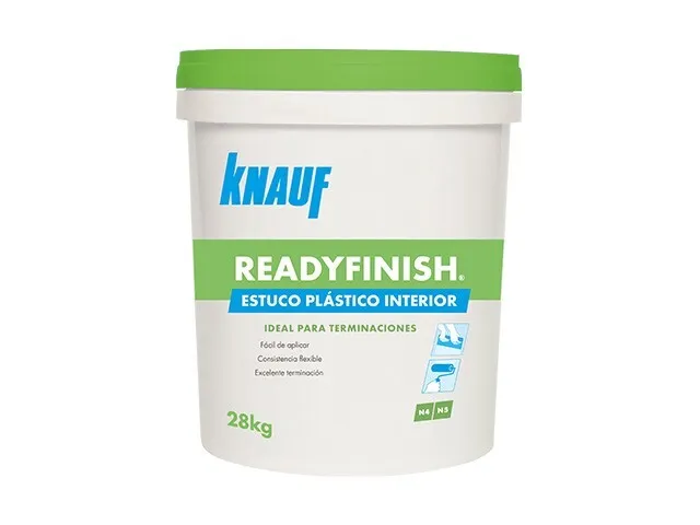 IDEAL PARA TERMINACIONESEstuco interior lista para usar, de secado aéreo a base de polímeros y cargas minerales de color blanco. Readyfinish corresponde a los niveles de calidad de acabado: N4 y N5.PREPARACIÓN Y APLICACIÓN:Readyfinish se utiliza especialmente en la sup...